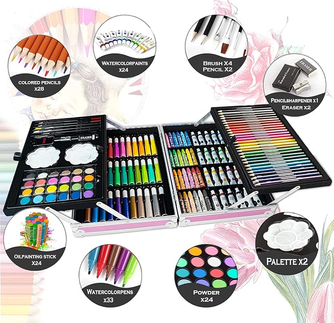 - 145 Premium Supplies: Includes colored pencils, oil pastels, watercolor paints, brushes, sketch pads, and more.