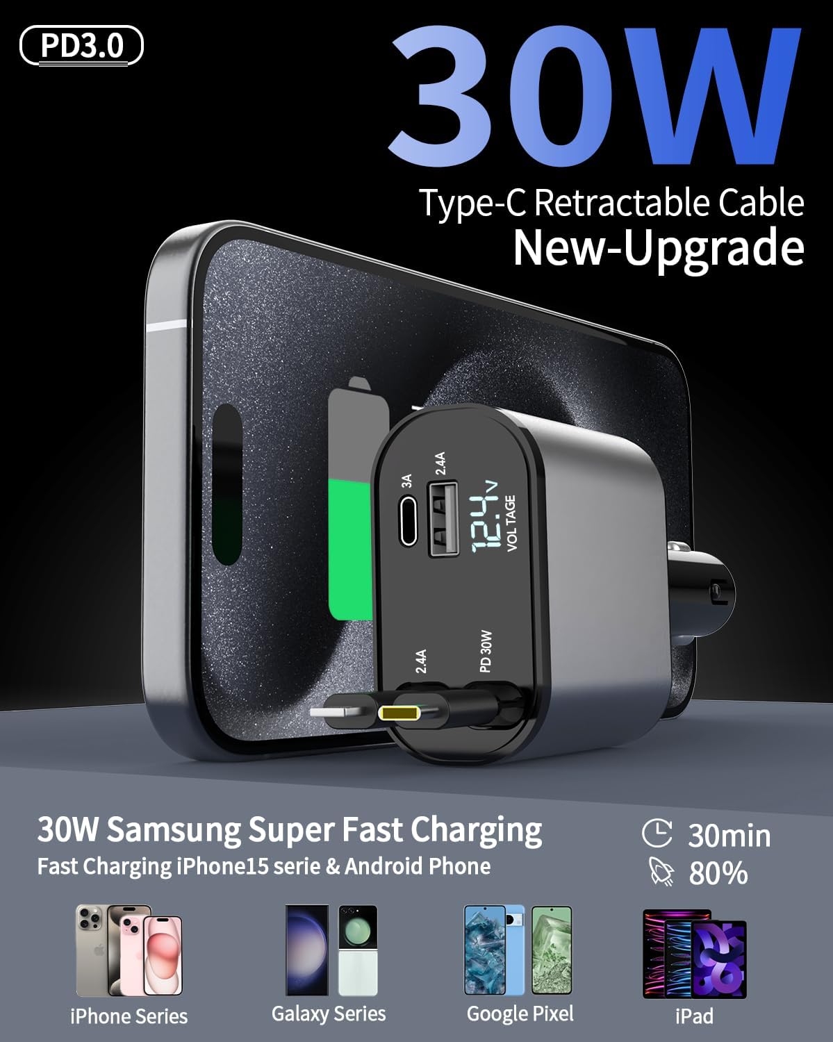 Charge smarter and drive safer with our 4-in-1 Retractable Phone Car Charger!